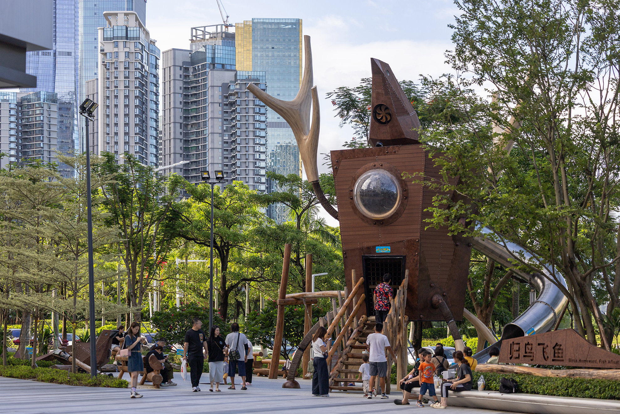 Hengqin lsland, a modern tourist destination rich in natural resources,is uniquely located, backed by the Pearl River Delta, facing theSouth China Sea, and opposite Macau's three islands across theriver. lt possesses precious coastal wetlands and is a natural basefor mangroves. This area provides an ideal habitat for Chinese whitedolphins and migratory birds, serving as a key stopover on theirmigration route.Design inspiration comes from these natural elements. Mangroves,Chinese white dolphins, and migratory birds are integrated into the sitedesign, creating a shared ecological habitat from multiple perspectives(human, bird, mangrove), showcasing Hengqin's harmony with nature.